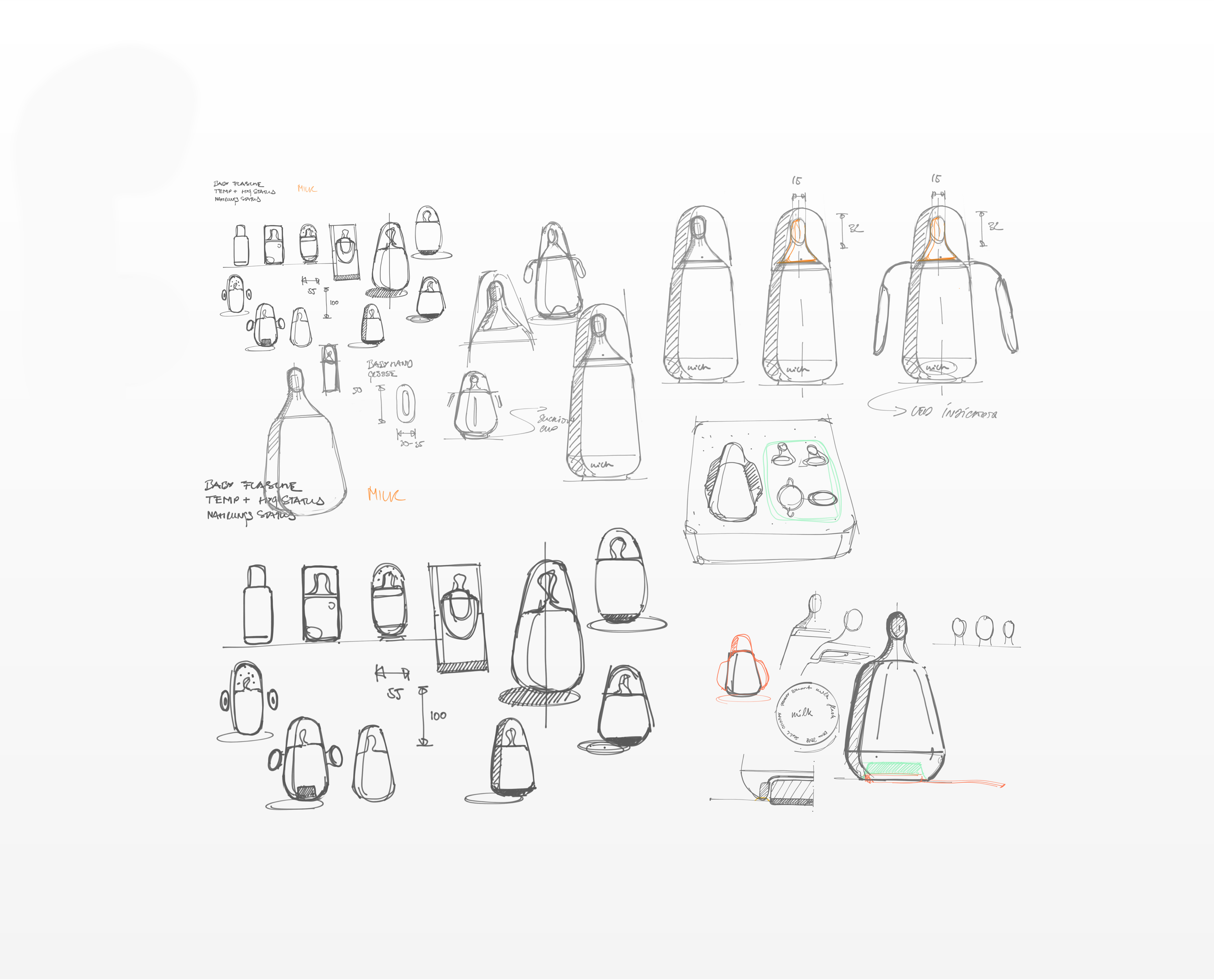 Milk is an intelligent baby bottle. A removable sensor array in the base of the bottle lets parents keep track of the temperature and quantity of baby formula. An optional handle-module can be attached to the top of the flask as well as differently sized suction pieces.